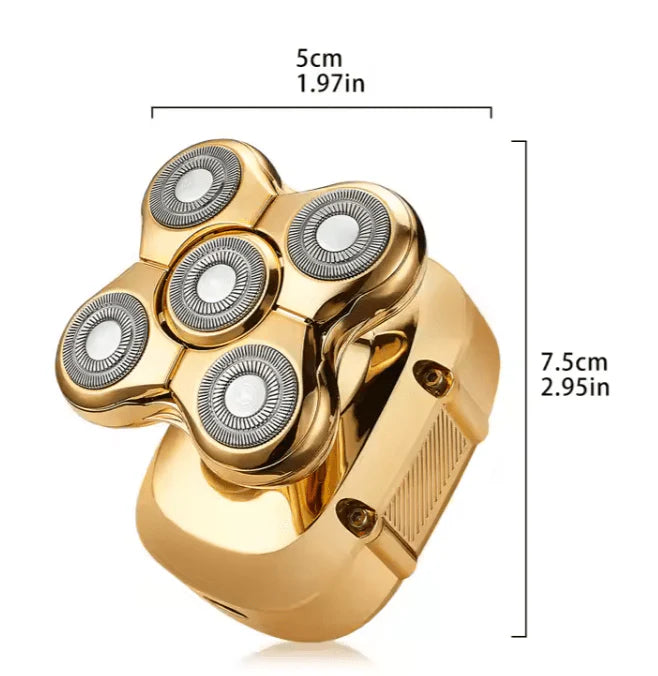 5‑in‑1 heads: rotary shaver, hair clipper/trimmer, nose & ear trimmer, facial cleansing brush, soft sponge/massage head